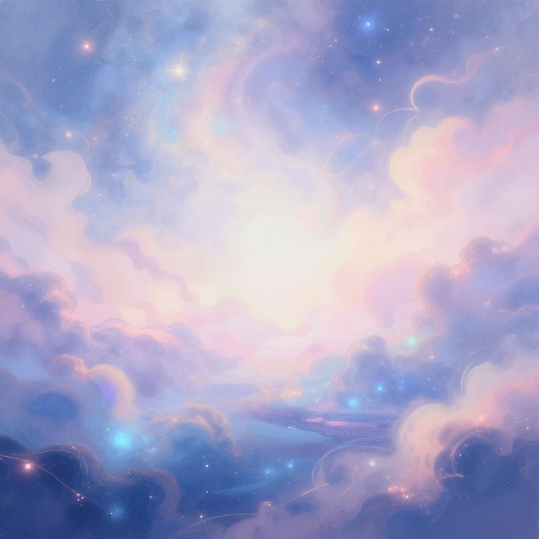 This is a digital CGI artwork depicting a vibrant, ethereal sky. The central focus is a bright, glowing white light that gradually transitions into soft pink and blue hues. Surrounding the light are wispy, cloud-like formations in pastel shades of pink, purple, and blue, giving a dreamy, celestial atmosphere. Small, sparkling stars are scattered throughout the sky, adding to the cosmic feel. The overall texture is smooth with a soft, almost translucent quality. The image evokes a sense of wonder and otherworldliness, reminiscent of a magical or mystical sky scene.