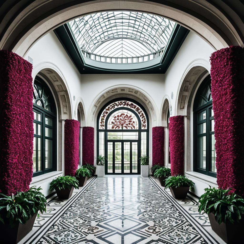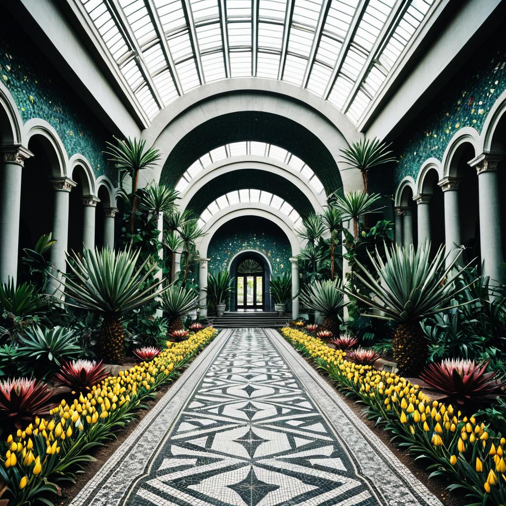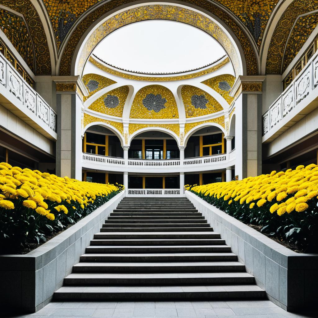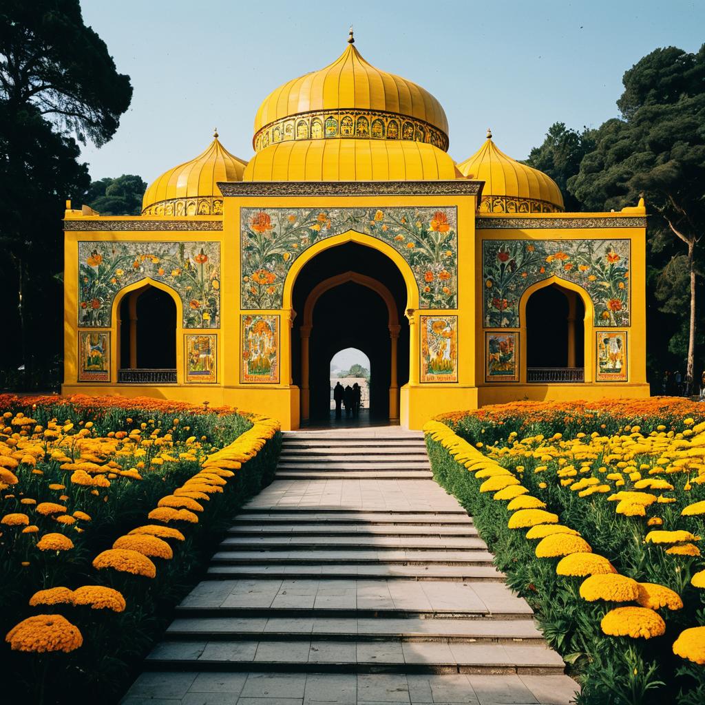 Product Photography of a beautiful iziers pavilion that is inspired by the beauty of the yellow marigold. The building should have a unique and striking appearance, with a shimmering metallic exterior that reflects light and changes color like the marigold petals. The entrance should feature a grand archway resembling the flowers shape, while the interior should have natural light, intricate mosaics, and frescoes depicting scenes from nature. The upper levels should have stepped terraces with various species of marigold, creating a lush environment for visitors, two point perspective, architectural photograph, 70mm.