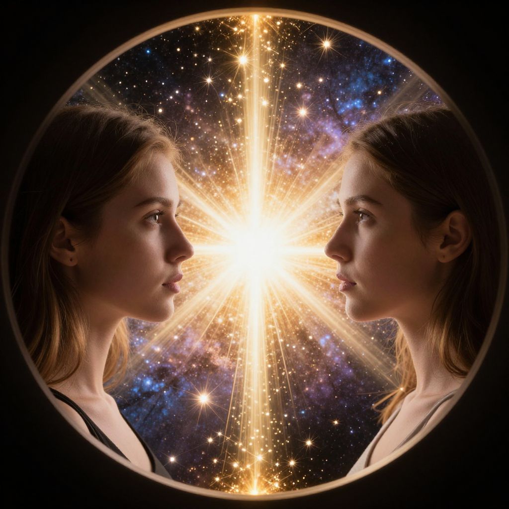 Two identical profiles of a woman, framed within a circular portal, gaze inward against a radiant cosmic backdrop, illuminated by golden sparks and a central beam of light, symbolizing introspection and duality.
