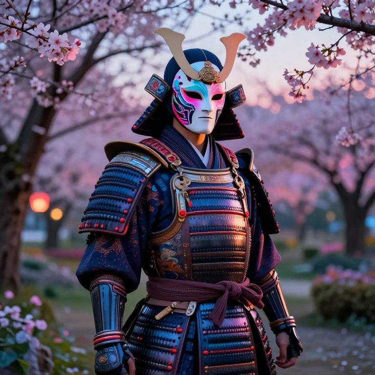 Envision a harmonious fusion of Renaissance grandeur with a futuristic touch, depicting an enigmatic scene where a cyberpunk samurai clad in intricate Japanese armor stands amid a technicolor garden of luminescent cherry blossoms at twilight. The samurai's face remains hidden beneath a cutting-edge mask that mirrors the dazzling hues and designs of the environment, symbolizing a captivating blend of ancient customs with high-tech innovation. As daylight fades over this digital Eden, the softening light elongates shadows across the landscape, generating an emotional spectrum from warm, radiant tones to cool, otherworldly shades, encapsulating the ephemeral instant where past and future converge.