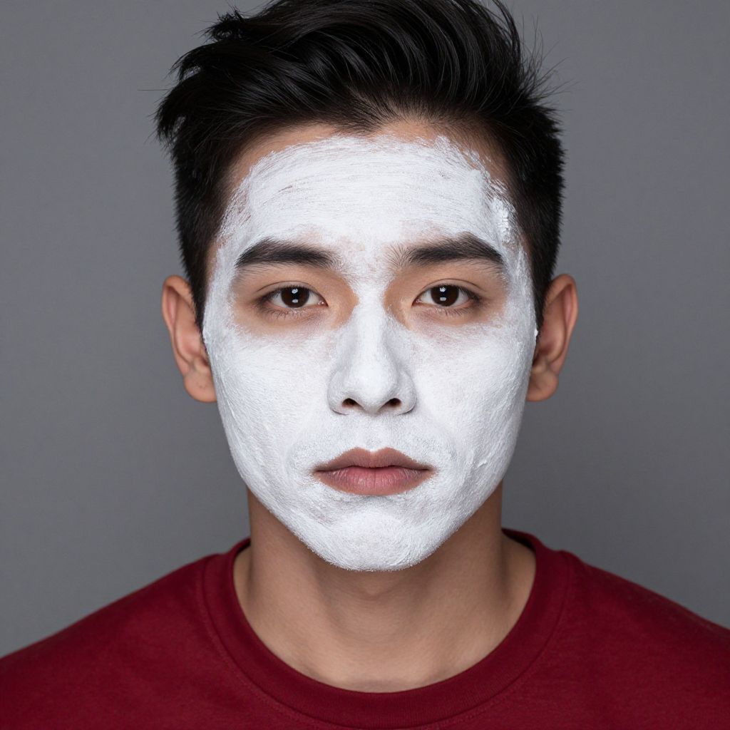 Photograph of an Asian man with short black hair, wearing a red shirt, against a plain gray background. His face is covered in a thick, white, textured paste that obscures his skin, creating a stark contrast with his dark hair and red shirt. His expression is neutral, with slightly parted lips and dark, almond-shaped eyes looking directly at the camera. The white paste has a rough, granular texture, giving a mask-like appearance. The lighting is even, highlighting the texture of the mask and the man's facial features.