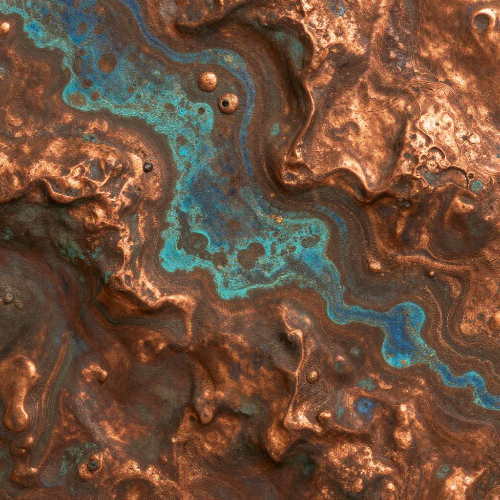Patina copper texture showcasing natural aging process, rough metallic surface with green-blue oxidation spots, high detail, macro shot emphasizing textures and color variations