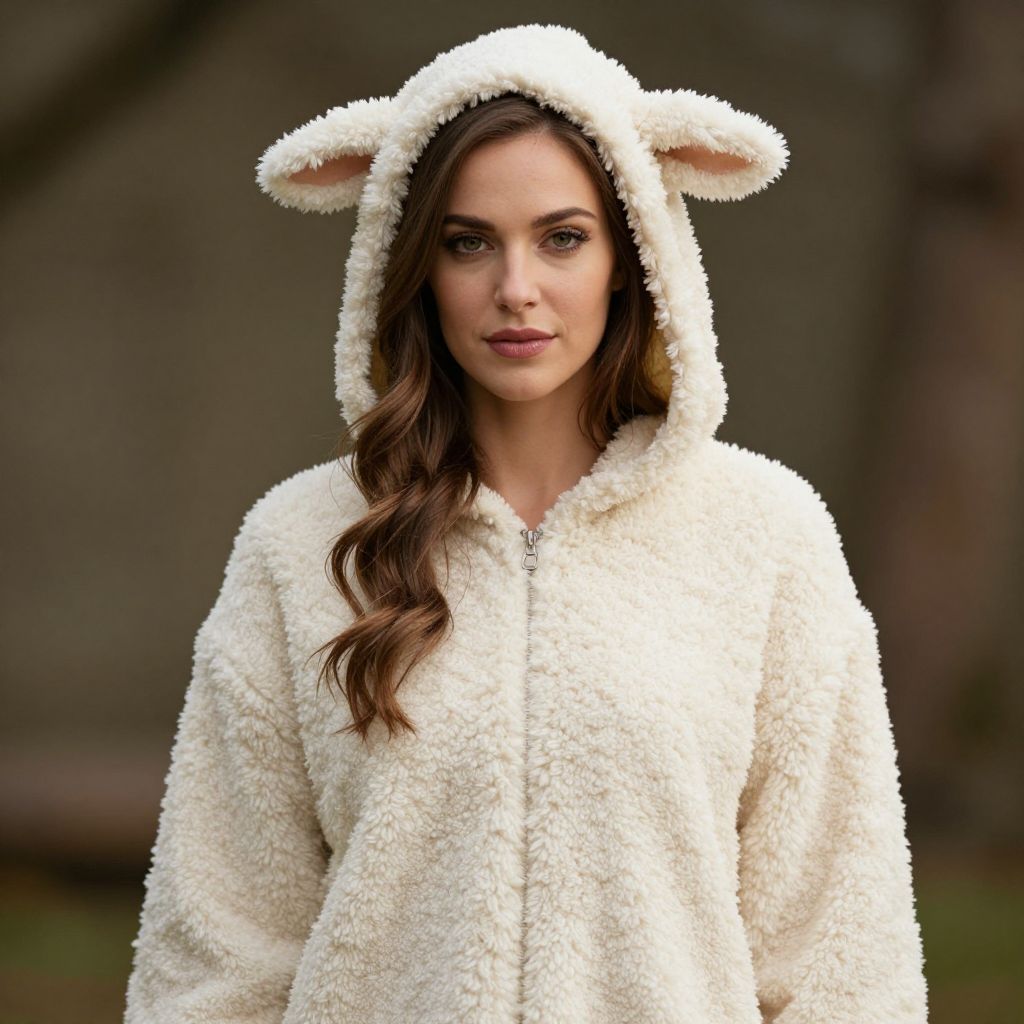 Sheep Nativity Costume, woman in a sheep costume with a hood on