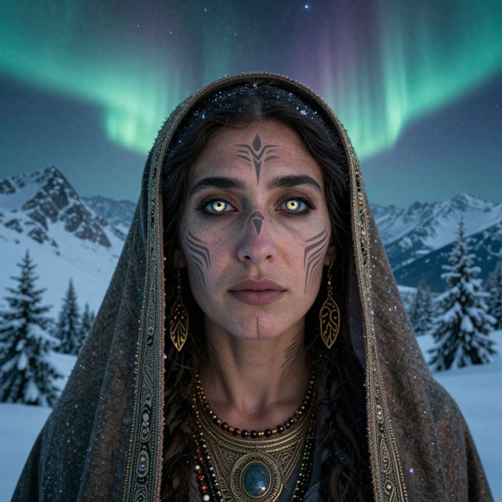Envision a portrait photograph of an enigmatic Middle Eastern shaman, her gaze illuminated by cosmic auroras dancing across midnight skies. The deep-set eyes, reflecting ancient secrets, are set amidst icy peaks and snow-covered evergreens. An unusual aerial perspective showcases intricate tribal markings and handcrafted attire, with soft arctic air gracefully accentuating the rugged textures of her weathered face. This image evokes a profound emotional gradient, from mystic reverence to solitude, inviting viewers on a journey through time and space to uncover the wisdom and wonder concealed within this captivating portrait.