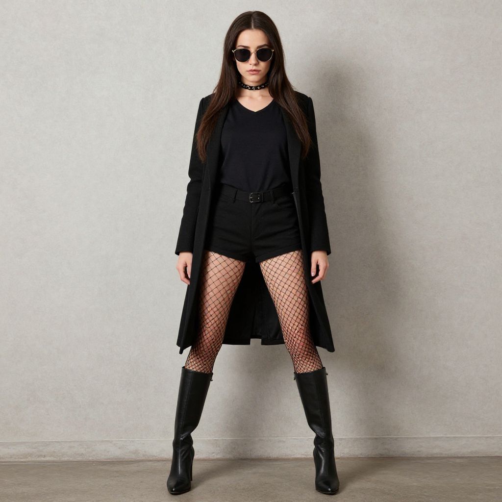 Photograph of a blonde woman with a choker, white tank top, black jacket, high-waisted shorts, belt, and black sneakers,