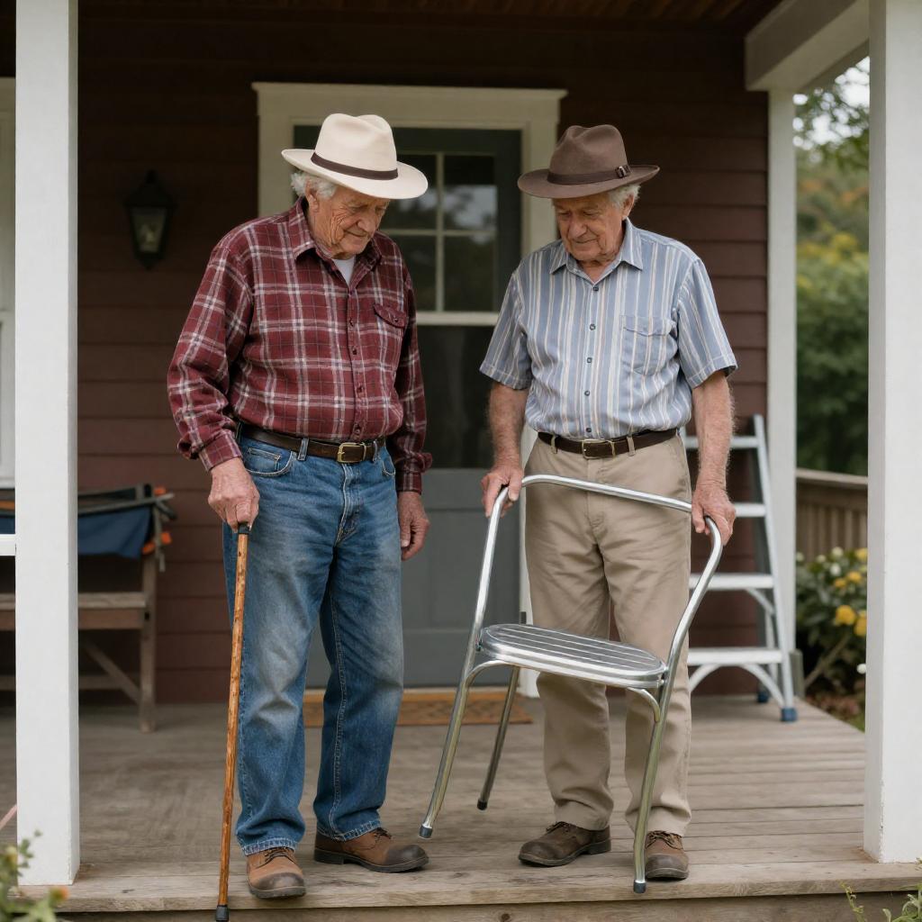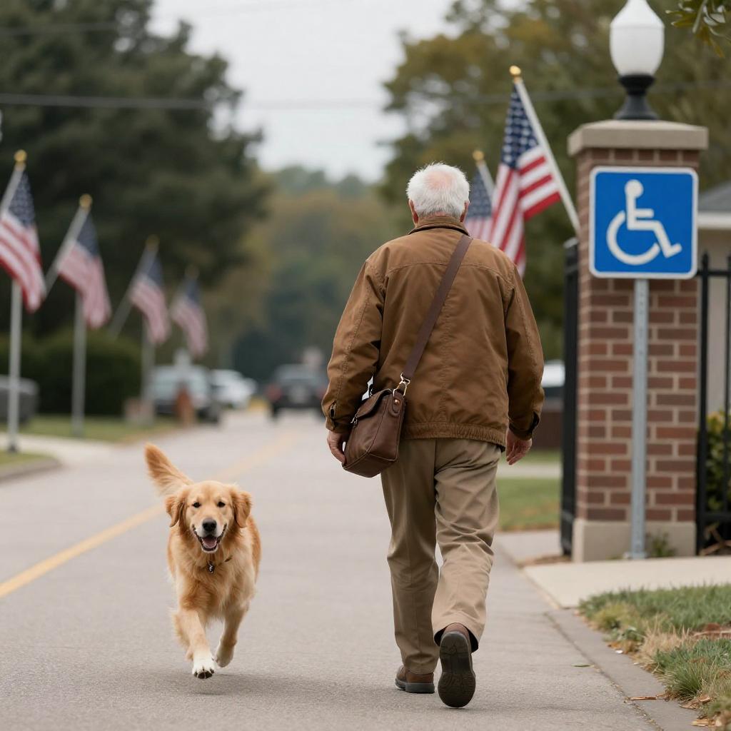 Elderly man with brown jacket and tan pants walks on paved road, brown shoulder bag, golden retriever runs ahead. Road lined with American flags, blue handicap sign on right, brick gate post with lamp, trees in background.