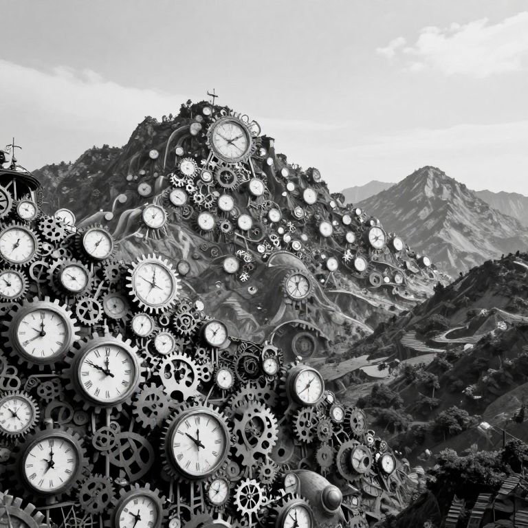 Mountains constructed entirely of clocks and gears rise and fall rhythmically like breathing giants, their ticking harmonies resonating as wind through valleys.