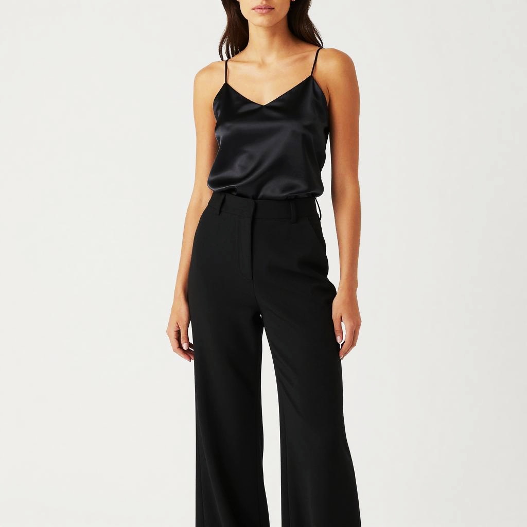 Tall curvy woman, casual chic, sleek black satin camisole with high-waisted wide-leg trousers, studio with directional softbox lighting and subtle backlight, full-body fashion editorial, relaxed natural pose, clean seamless backdrop, natural makeup with soft smoky eyes, long straight hair, true-to-life skin texture, crisp fabric detail, no logos, high-resolution, ISO 200, f/4, 50mm lens, controlled shadows, subtle vignette, refined post-processing, color-accurate rendering