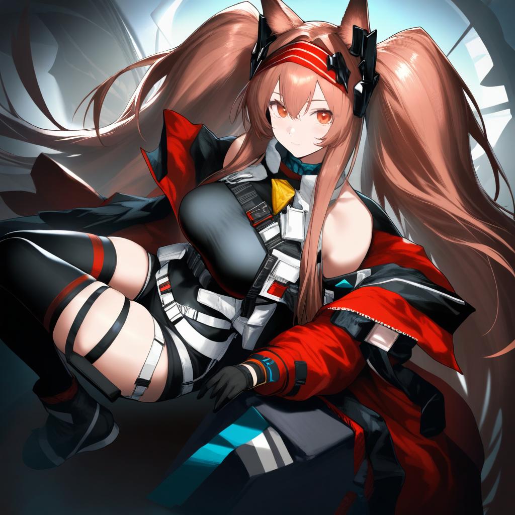 Angelina (distinguished visitor) (arknights), arknights, 1girl, fox ears, red eyes, hair between eyes, brown hair, very long hair, red hairband, twintails, sidelocks, medium breasts, large breasts, thighs, thigh strap, black thighhighs, black gloves, red coat, black leotard, open coat, red jacket, open jacket, bare shoulders, off shoulder, long sleeves, white belt, infection monitor (arknights), by artist hakai shin, animagine