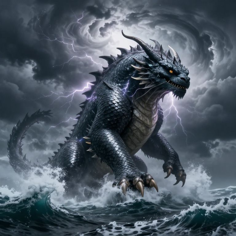 Digital artwork of a fierce, black-scaled dragon with glowing yellow eyes, lightning bolts, and sharp claws, roaring amidst stormy waves.