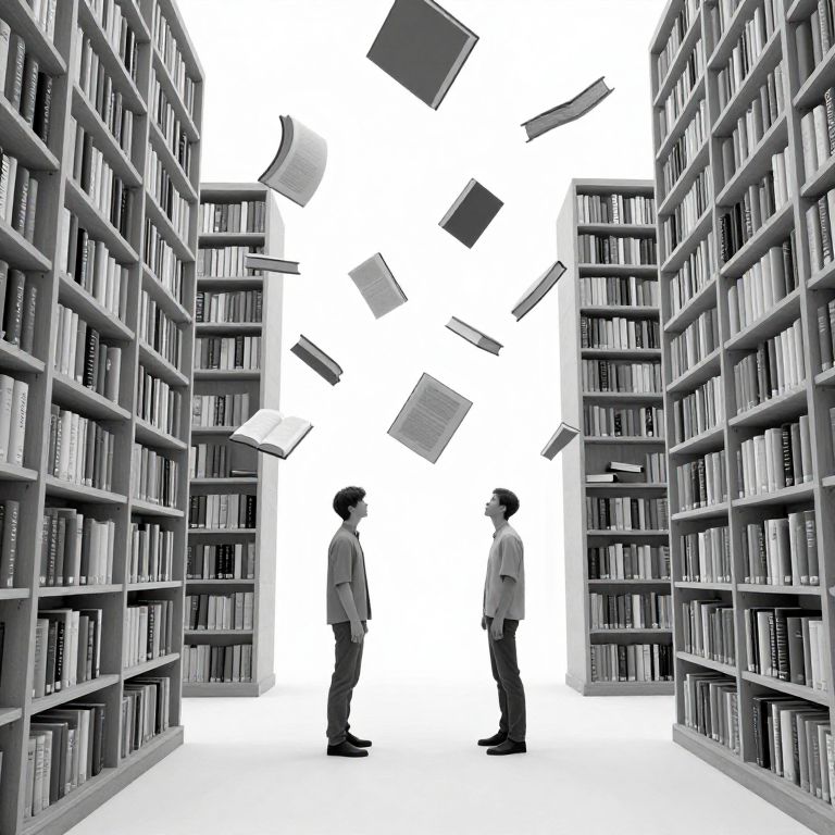 Black-and-white digital drawing of two silhouetted figures standing in the middle of a narrow aisle between towering bookshelves. Books of various sizes and shapes are floating in the air between them. The figures, one on each side, have short hair and wear casual clothing. The shelves are densely packed with books, creating a sense of depth and symmetry. The background is stark white, emphasizing the contrast and focus on the characters and floating books. The overall style is minimalist and slightly surreal.