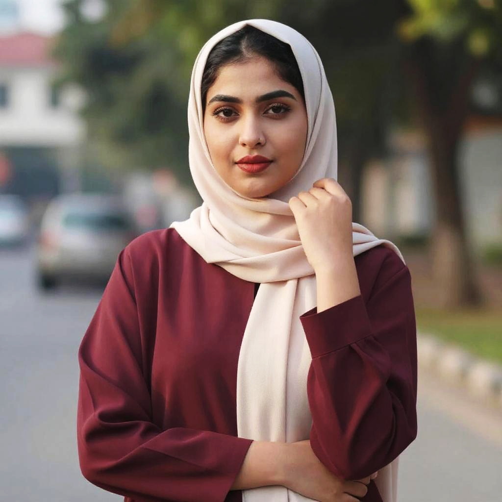 Creative shot of a woman wearing a hijab, blending traditional and modern styles, subtle emphasis on silhouette, warm tones, blurred cityscape at sunset in background