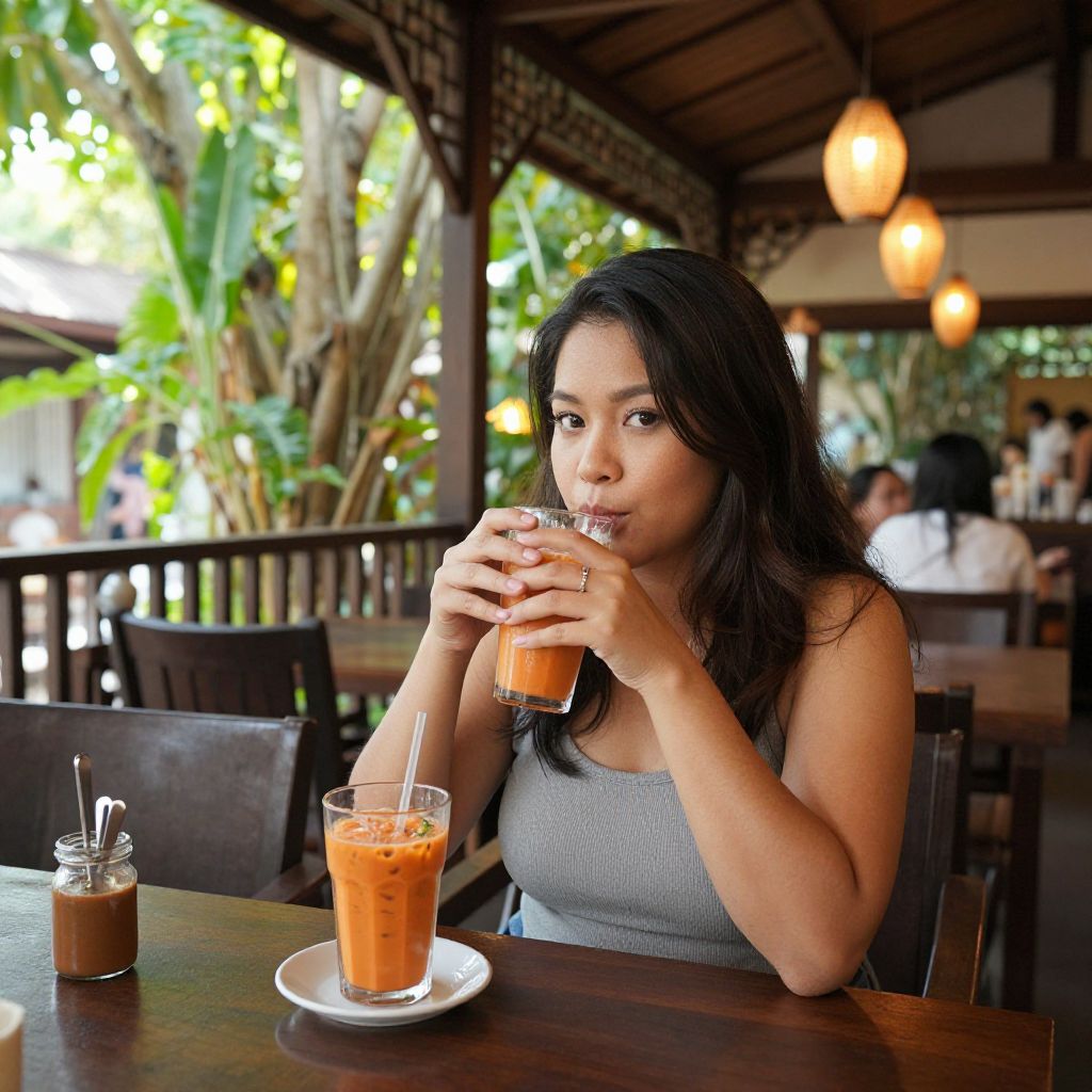 Cozy scene of a BBWThai woman enjoying a quiet moment drinking traditional Thai iced tea at a classic wooden café, surrounded by lush greenery and hanging lanterns, soft afternoon sunlight creating warm ambiance, photorealistic and inviting.