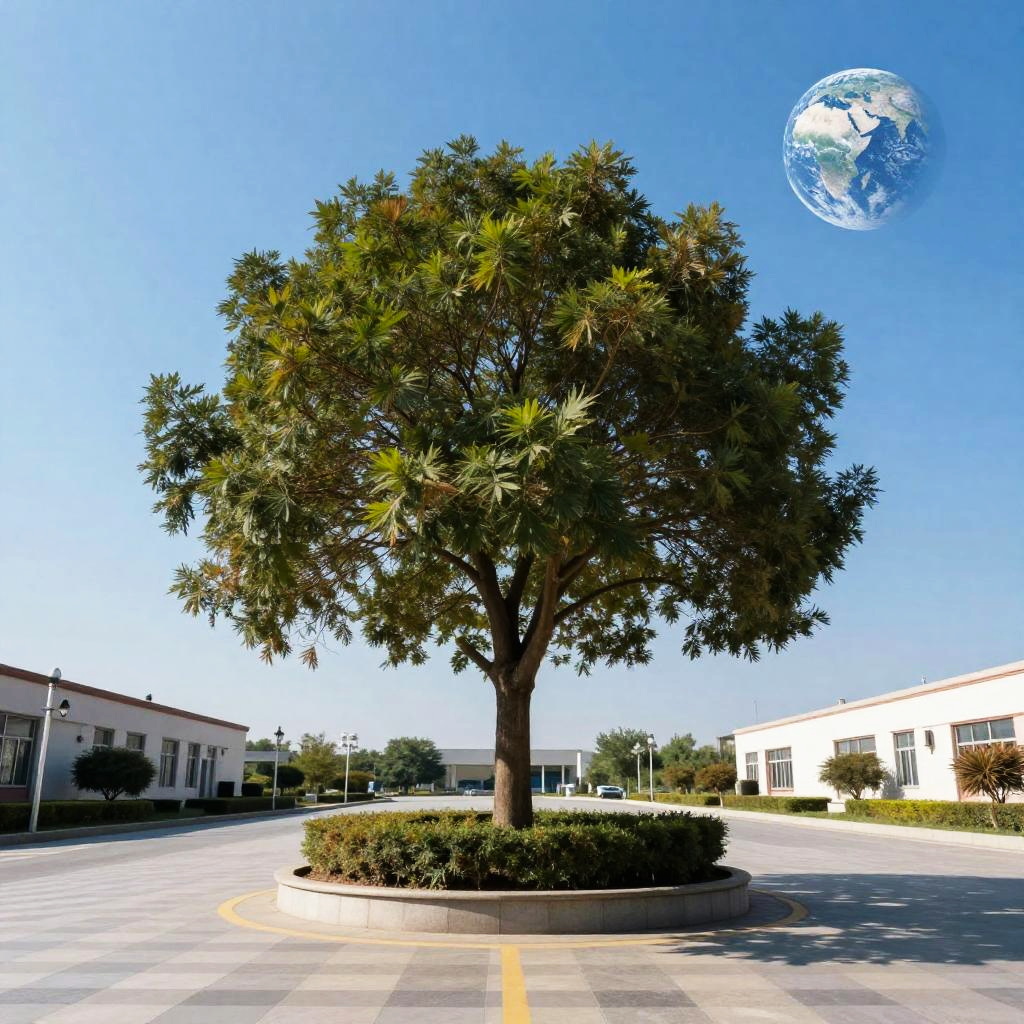 Tree, planet, sky, scenery, outdoors, blue sky, checkered floor, day, building, no humans, moon, earth (planet), traditional media, shadow, road, bush, crosswalk