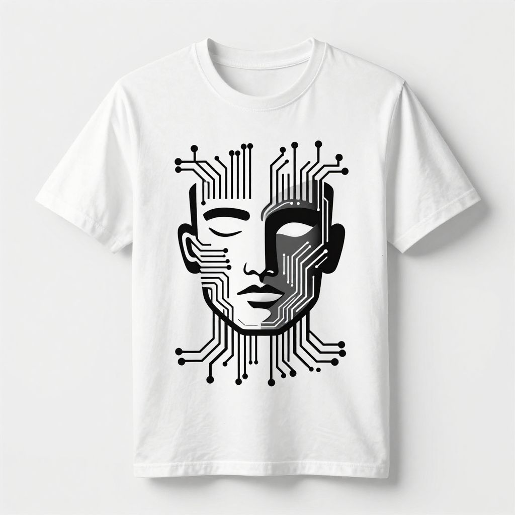 AI t-shirt design generator designing minimalistic yet striking composition with clean lines, stylized circuit board patterns forming abstract faces, capturing the essence of artificial intelligence in a monochrome palette for contemporary casual wear.