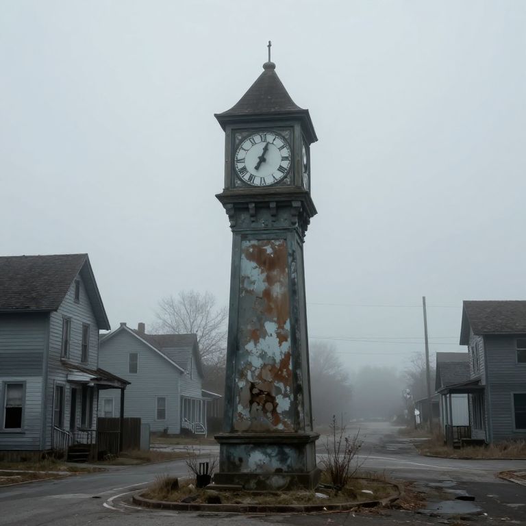 Weathered clock tower stands tall amidst a foggy, abandoned town, its hands frozen in time as dilapidated houses line the street, evoking a sense of forgotten history and eerie stillness.