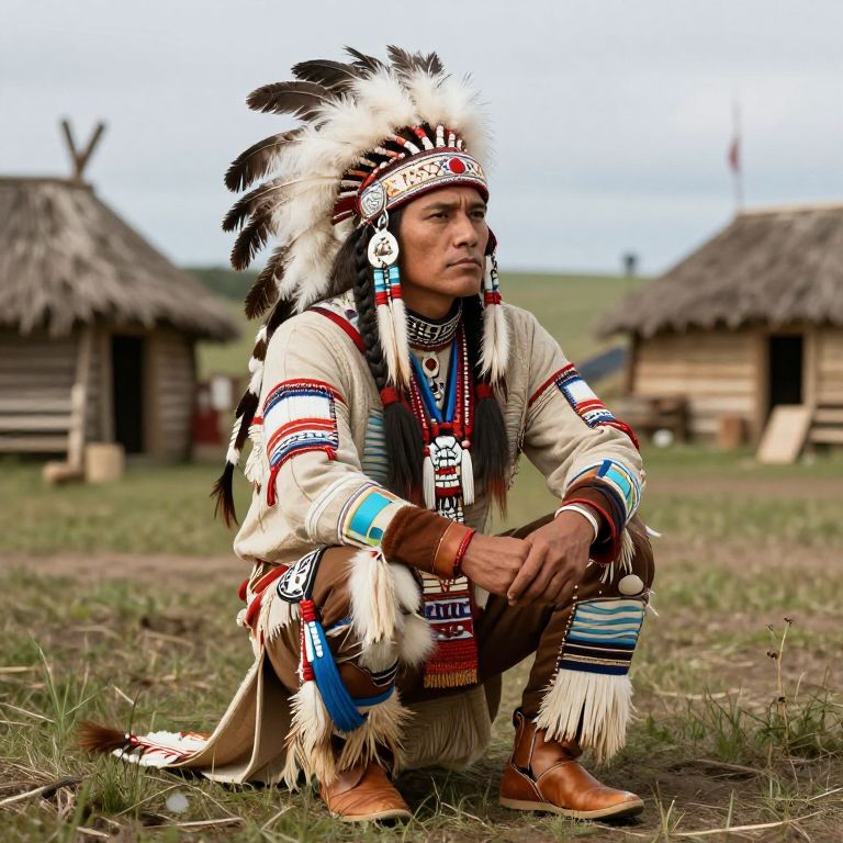 Portrait of a Native American in traditional Iroquois clothing, featuring feathered headdresses and leather moccasins, set against a rustic tribal village background, richly detailed.