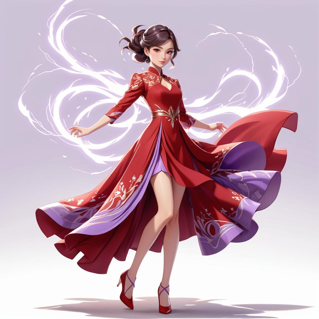 An animated young woman with flowing brown hair wearing a beautiful traditional red and purple dress with gold embroidery and high heels. She is depicted casting purple magical energy from both hands, with dynamic movement in her dress and a confident pose.
