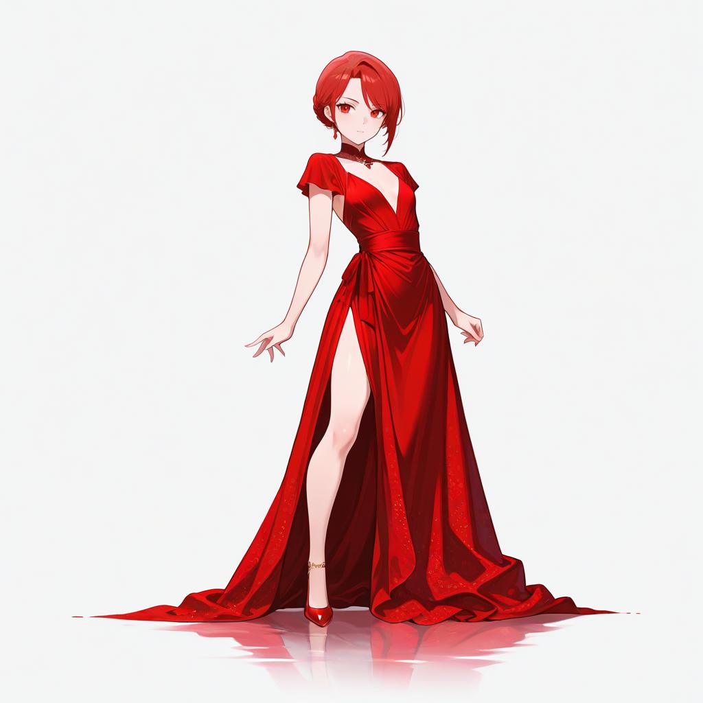 Full body, 1girl, solo, petite figure with tranquil lavender hues and elegant symmetrical features, red dress, elegant, graceful, flowing dress, intricate fabric patterns, vibrant red hue, formal attire, rich textures, animated stance on both knees, fierce determination shooting out like lightning, white background