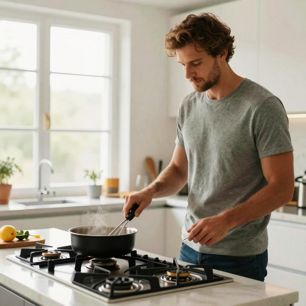 Handsome daddy cooking in a stylish kitchen, focused expression, modern appliances around, morning light through window, photorealistic detail, lifestyle theme