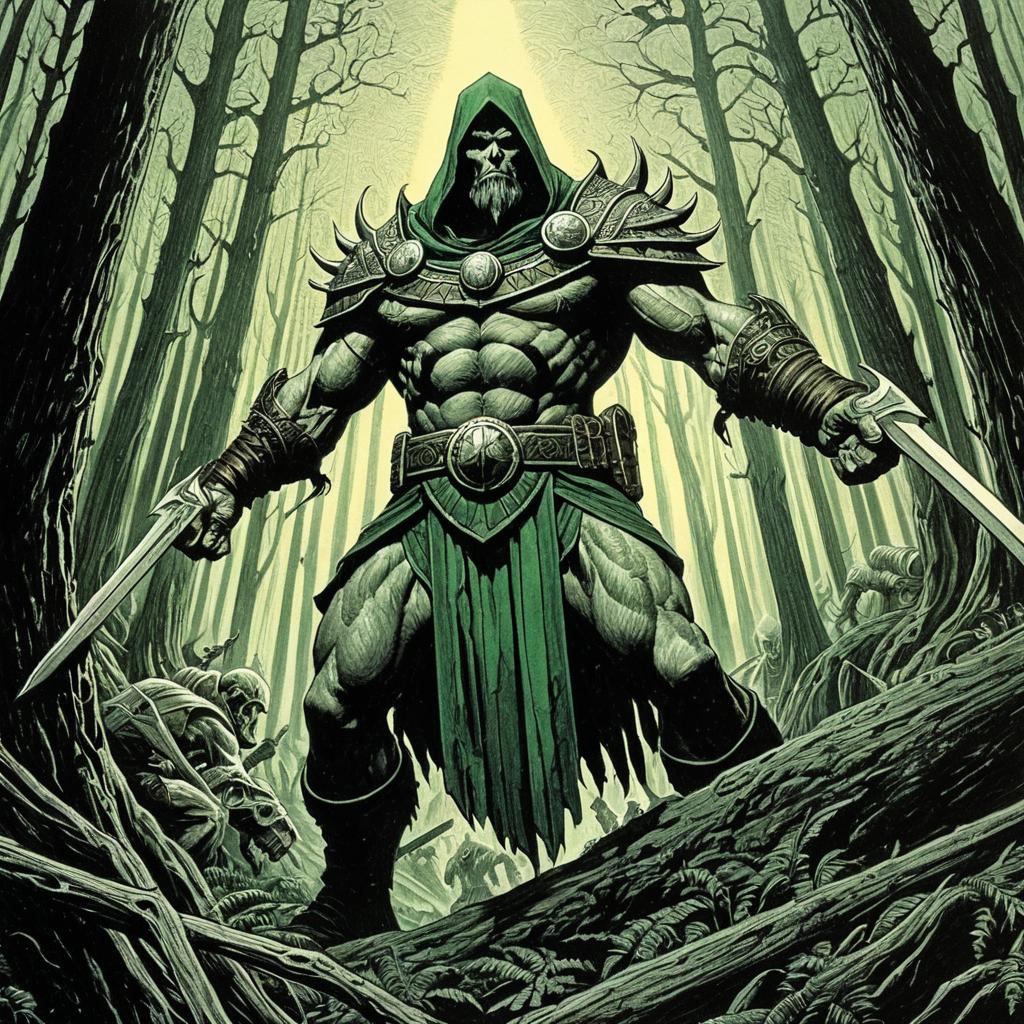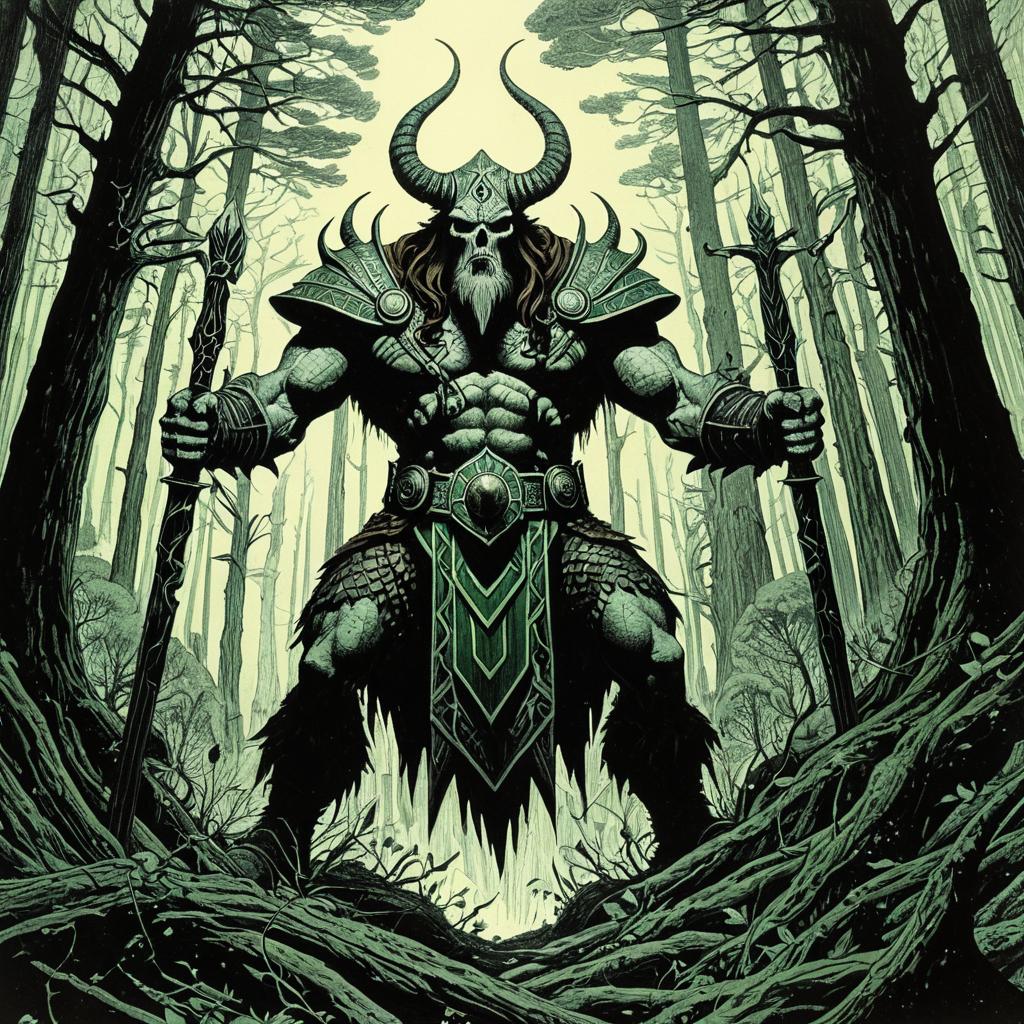 Illustration of a muscular horned warrior standing in a dense ancient forest. The warrior is clad in spiked armor with intricate patterns, holding two swords. The scene features fine line art with op art elements, rendered in shades of green, brown, and cream, with cinematic lighting and a mystical atmosphere.