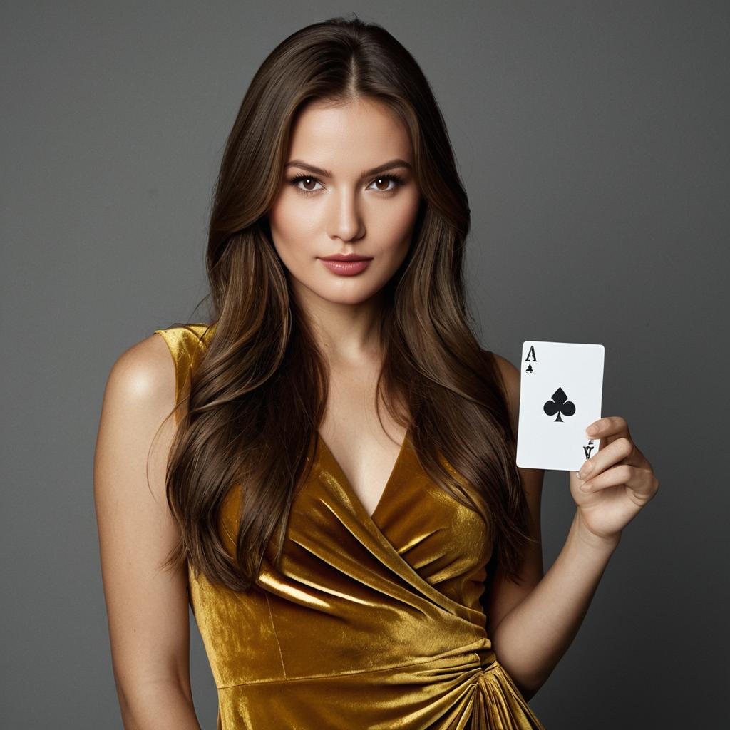 Cards against humanity, photo of beautiful young woman with long brown hair, wearing golden velvet dress, holding ace of clubs in right hand, neutral grey background, realistic, studio lighting, portrait, medium close-up, serious expression, soft shadows, elegant, refined ure, casual pose, subtle makeup, natural light.