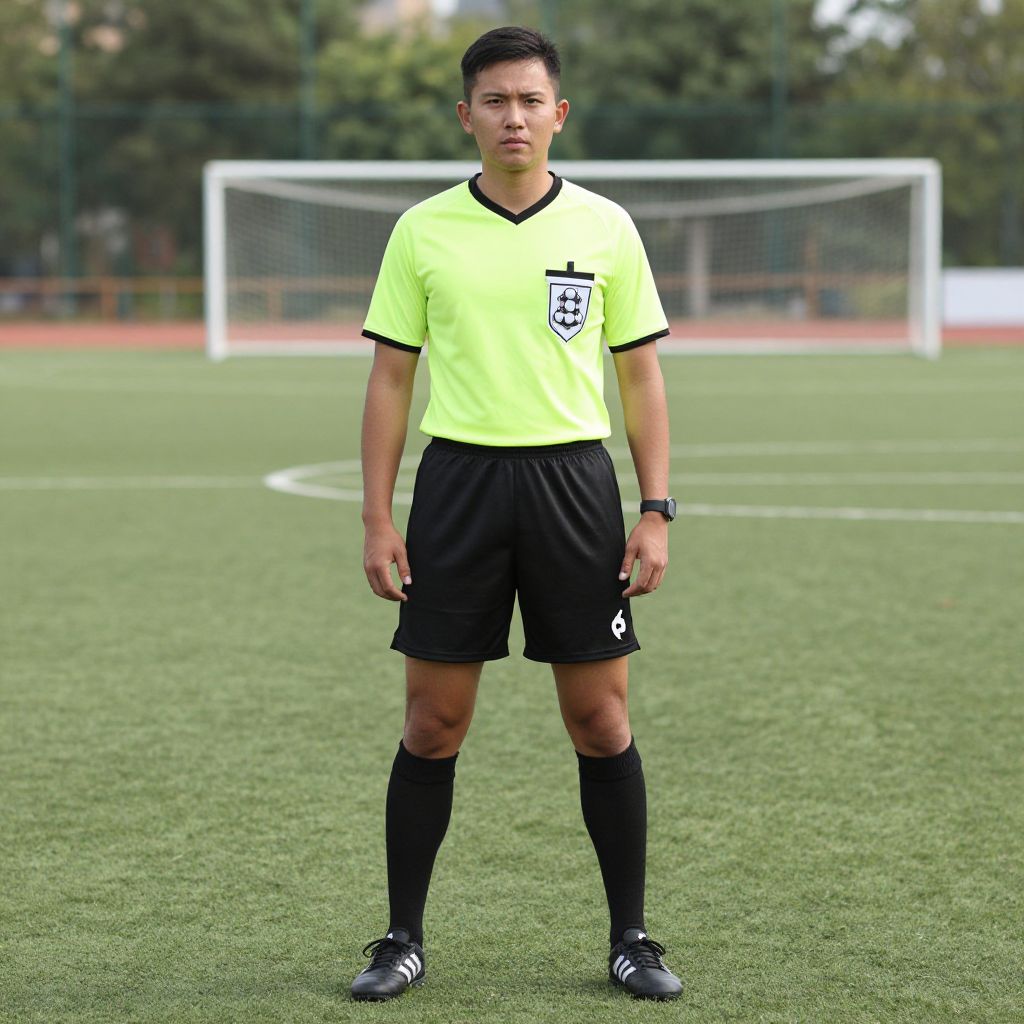 Photograph of an Asian male soccer referee standing on a green field, wearing a neon yellow shirt, black shorts, and socks, with a goal in