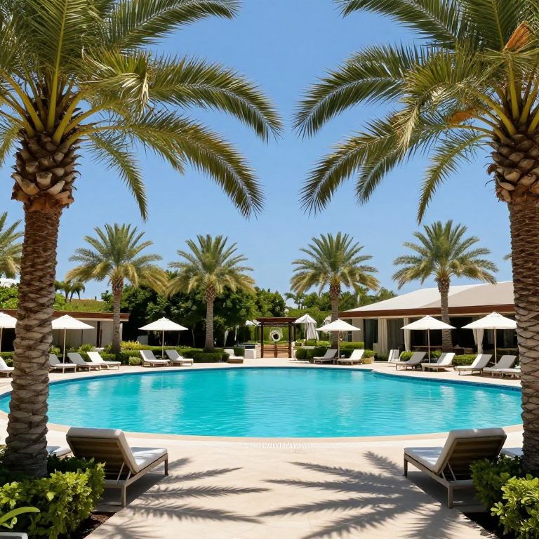 Photograph of a luxurious resort pool area on a bright sunny day. The clear blue pool is surrounded by white sun loungers and white umbrellas. Tall, lush palm trees frame the scene from both sides, their green fronds contrasting with the vivid blue sky. In the background, more palm trees and a small building are visible. The pool's edge is lined with light-colored tiles, and the poolside area is clean and well-maintained. The overall atmosphere is tropical and inviting, emphasizing relaxation and luxury.