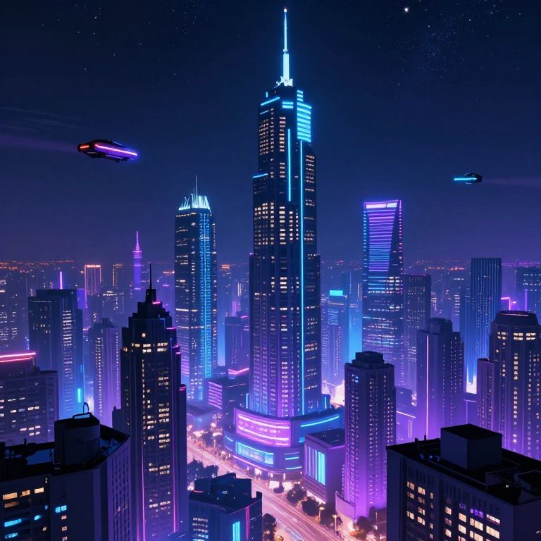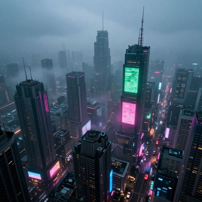 Neon-lit, futuristic cityscape photograph at night, with a flying drone, foggy sky, and vibrant, multicolored digital billboards