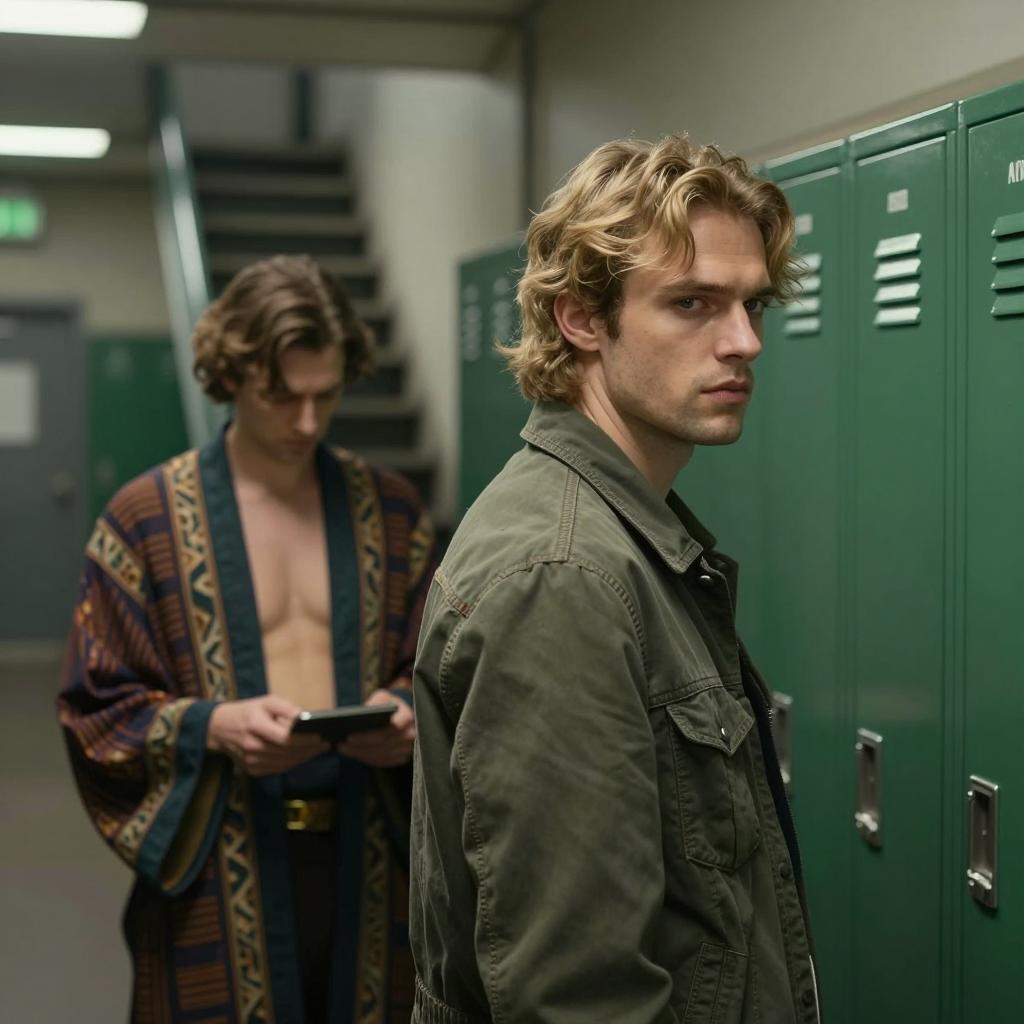 Two men in a dimly lit industrial hallway. Man in foreground, blond with wavy hair, intense gaze, green jacket, turned slightly to the right. Man in background, brown hair, patterned robe, open chest, focused on task. Green lockers on right, stairs in background.