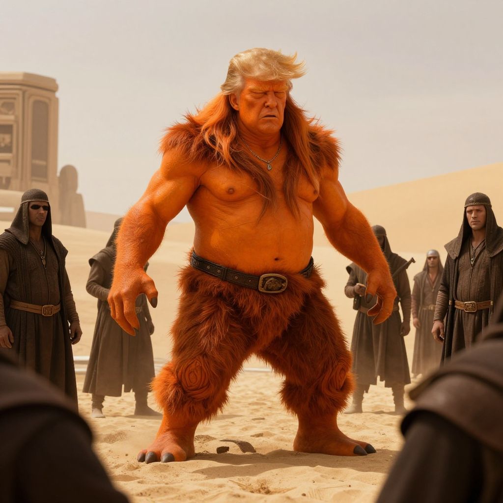 Jabba Trump transforming into a monstrous creature with orange skin and distinctive hair, surrounded by loyal henchmen in a dystopian desert setting, cinematic and surreal.
