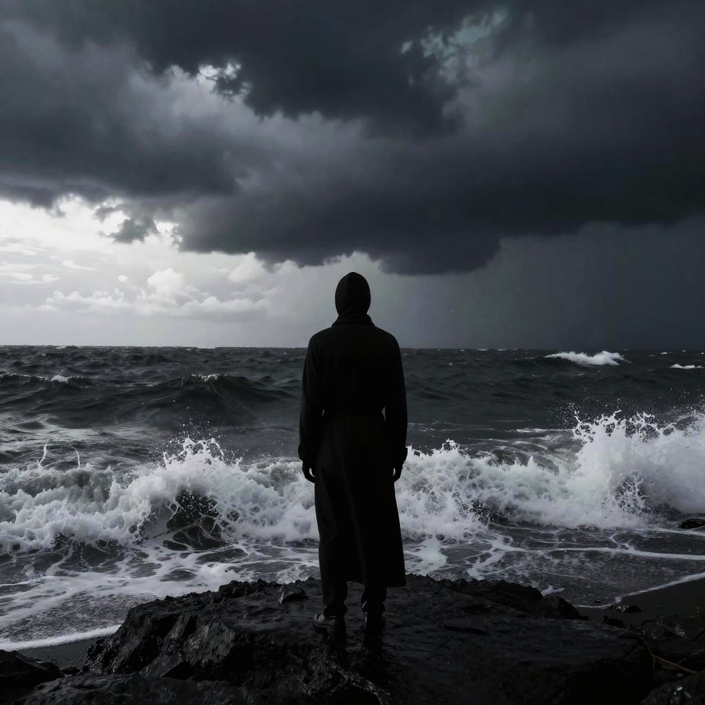 Silhouetted figure stands on rocky shore, facing turbulent, stormy ocean under dramatic, dark clouds with bright, breaking waves. Photograph.