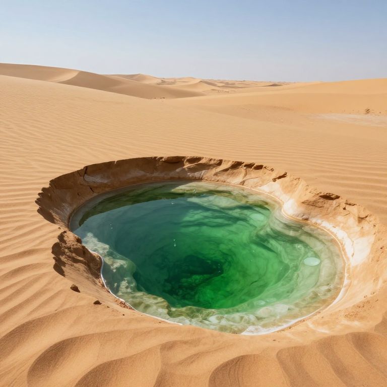 Photograph of a circular, clear blue-green waterhole in an expansive, sunlit desert. The waterhole has a rugged, eroded edge surrounded by undulating, rippled sand dunes in shades of light orange and beige. The water appears shallow with a swirling pattern at the center, reflecting the bright, clear sky above. The scene conveys a sense of isolation and natural beauty, with the contrast between the cool water and the warm sand creating a striking visual effect. The image captures the texture of the sand and the clarity of the water, emphasizing the desert's harsh yet serene environment.