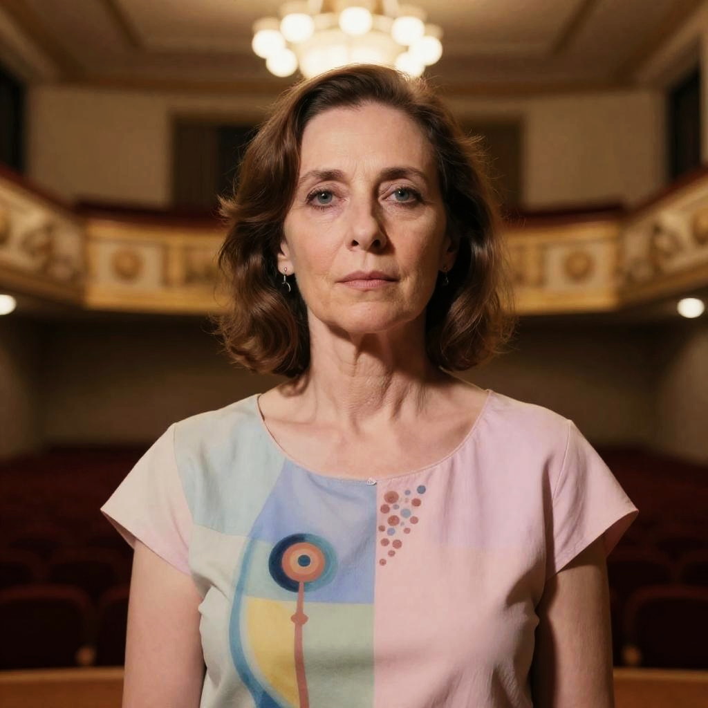 Realistic photo.surrealist portrait of a middle-aged female musician, pastel colors, concert hall background, influenced by Salvador Dalí, Wassily Kandinsky realistic photo