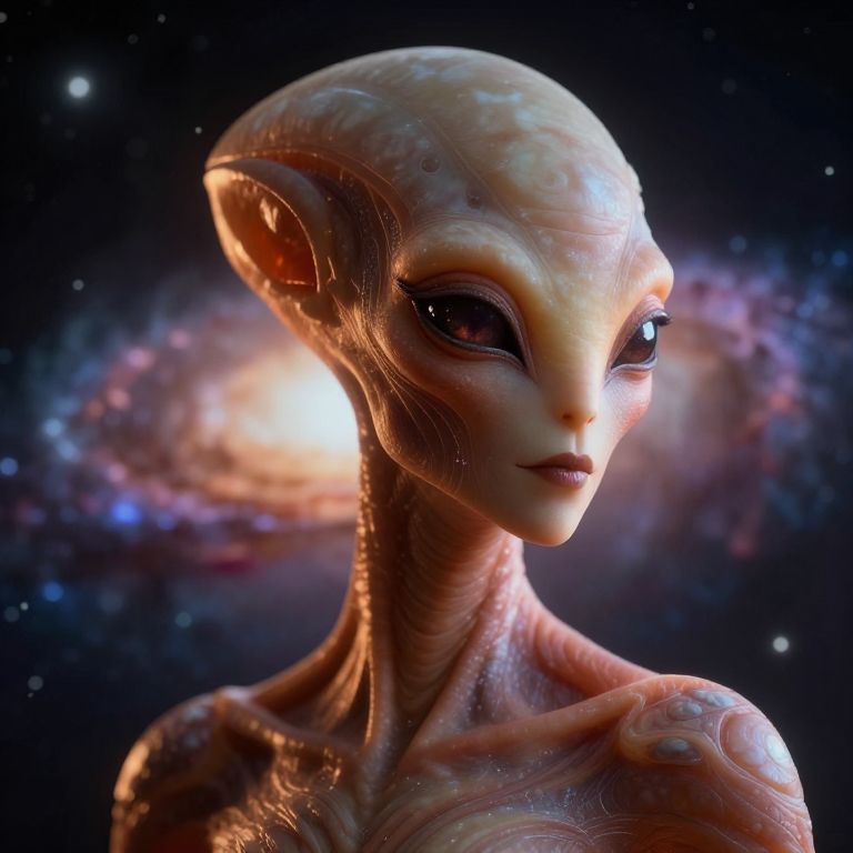Phoenix humanoid extraterrestrial from another universe with beautiful face and illuminating textures. Galaxy in the background. Warm light on face.,