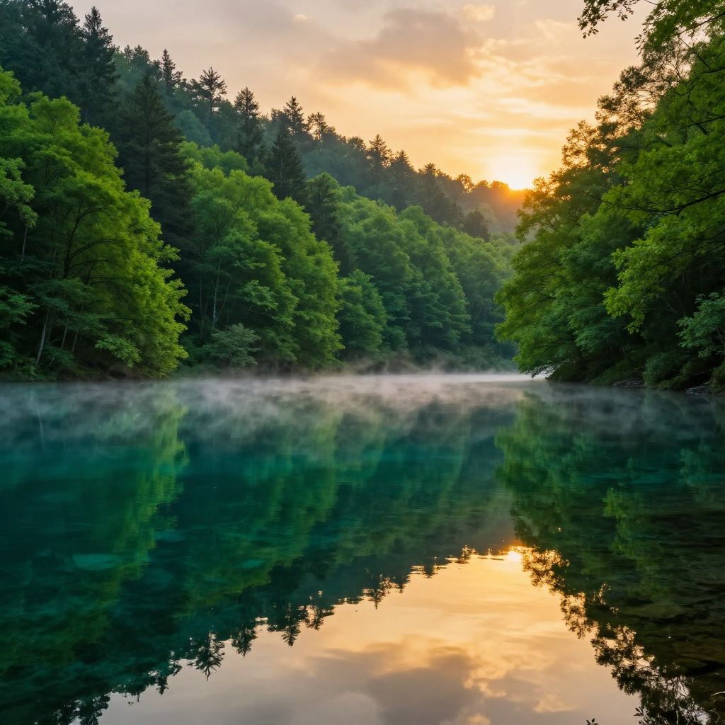 A serene autumnal landscape rendered in a hyper-realistic digital art style, featuring a tranquil lake mirroring the misty mountains and vibrant fall foliage, evoking a sense of ethereal beauty and introspection.