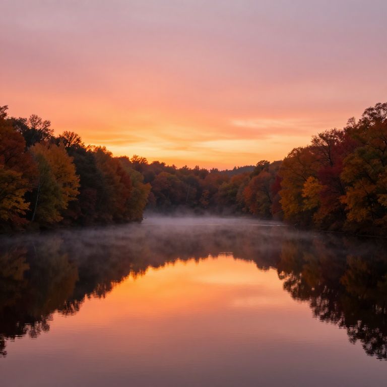 An ovalada shaped lake at sunset, calm reflective water surrounded by colorful autumn trees, mist rising softly from the surface, sky painted with warm orange and pink hues, peaceful landscape with high clarity