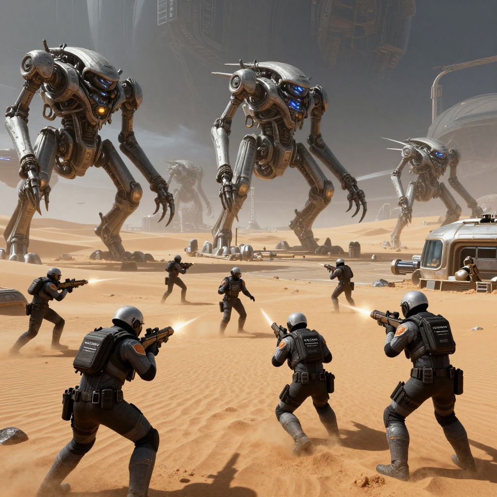 Helldivers aliens attacking a futuristic human colony on an alien desert planet, towering alien beasts with armored exoskeletons and energy weapons, Helldivers responding with coordinated strikes and tactical gear, intense color contrast and epic scale imagery.