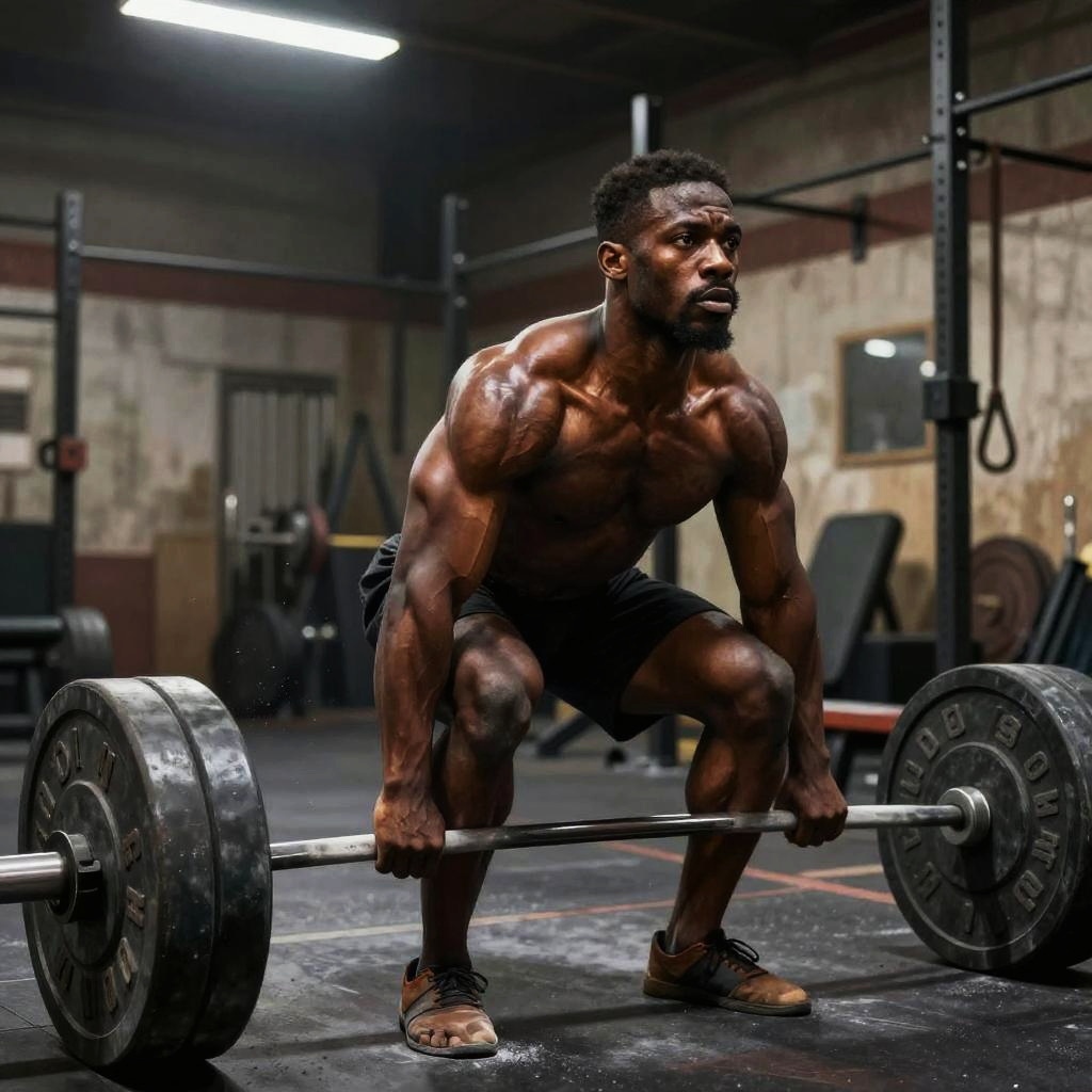 Photograph of a muscular, dark-skinned Black man with short curly hair, squatting with a heavy barbell in a dimly lit, gr