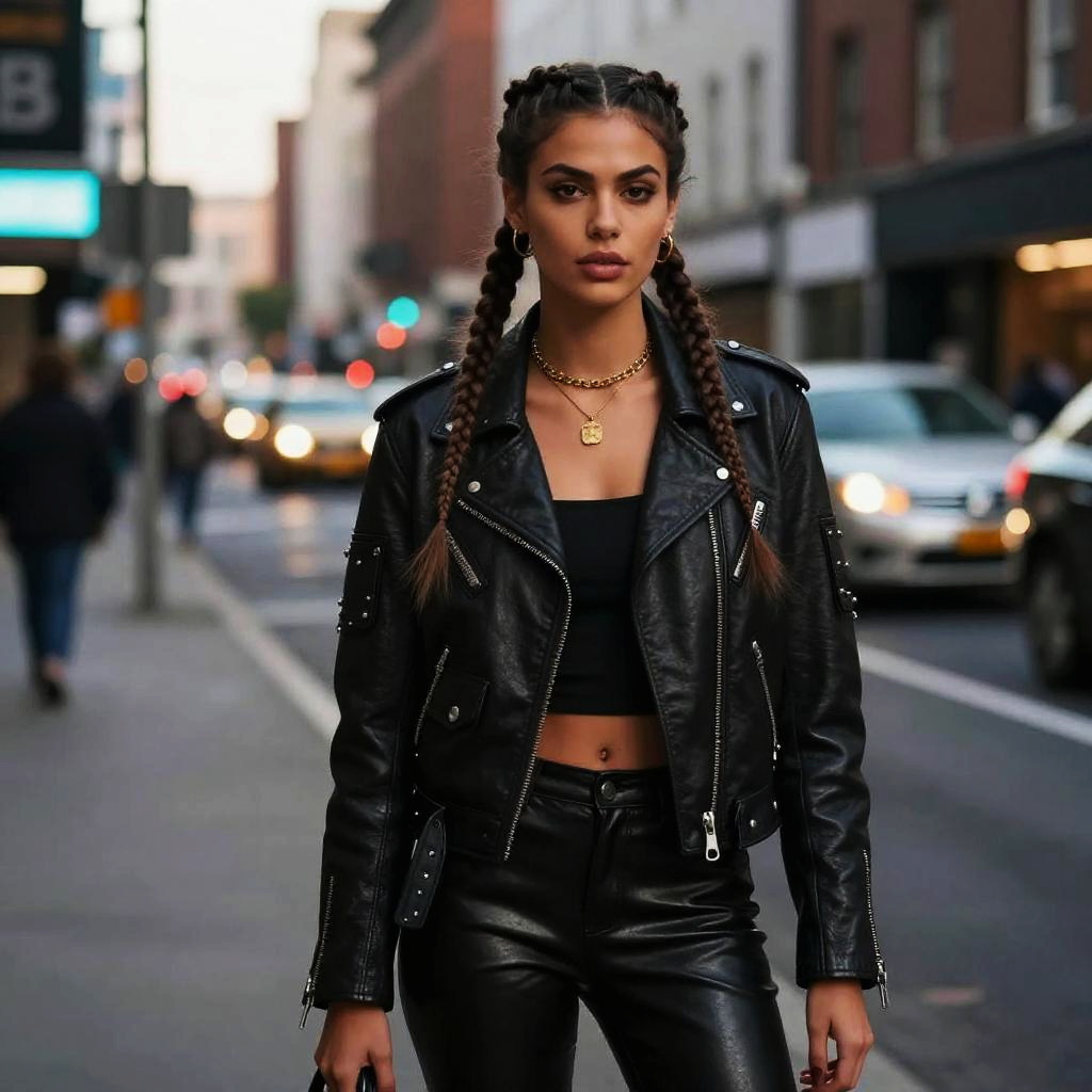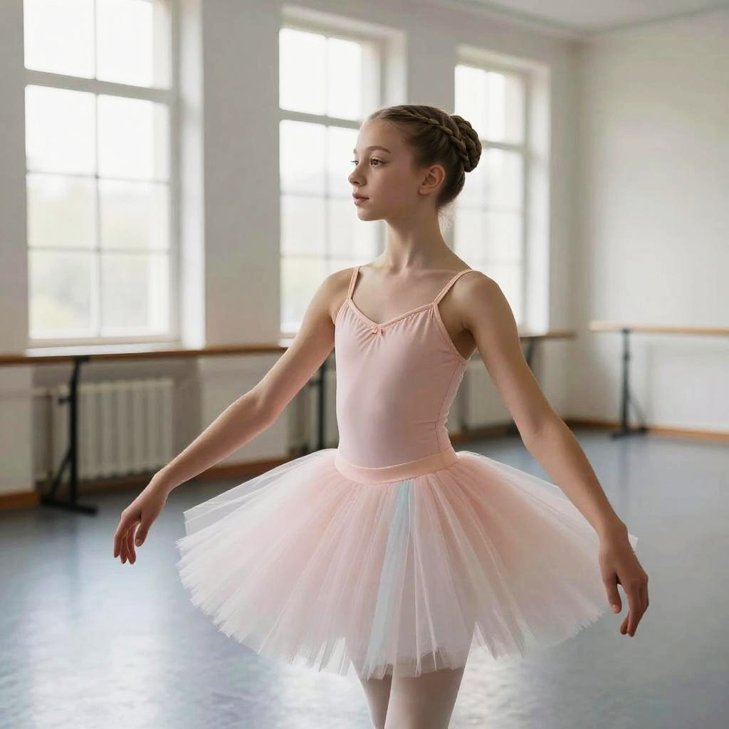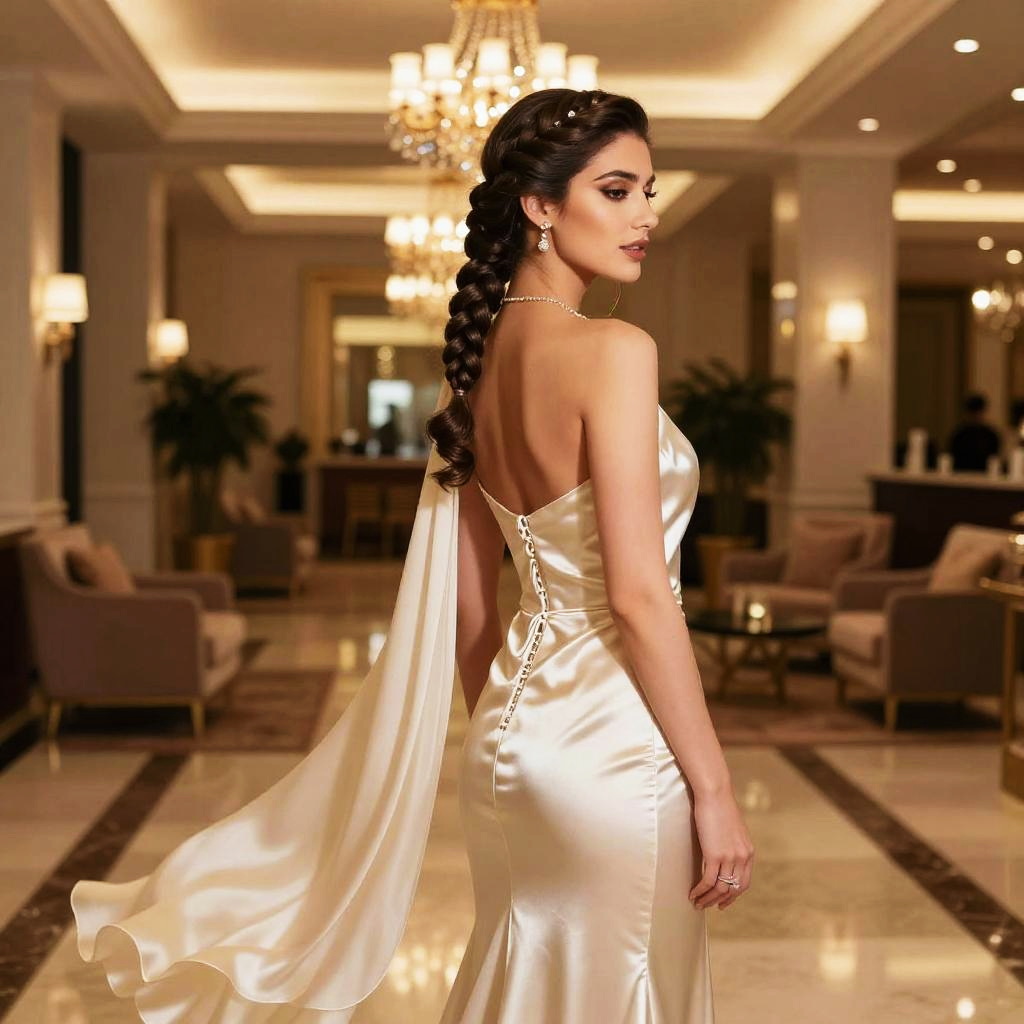 Dutch Crown Braid hairstyle on young fashion model, wearing minimalist monochrome dress, in contemporary art gallery, captured in fashion editorial style with bright diffused daylight.