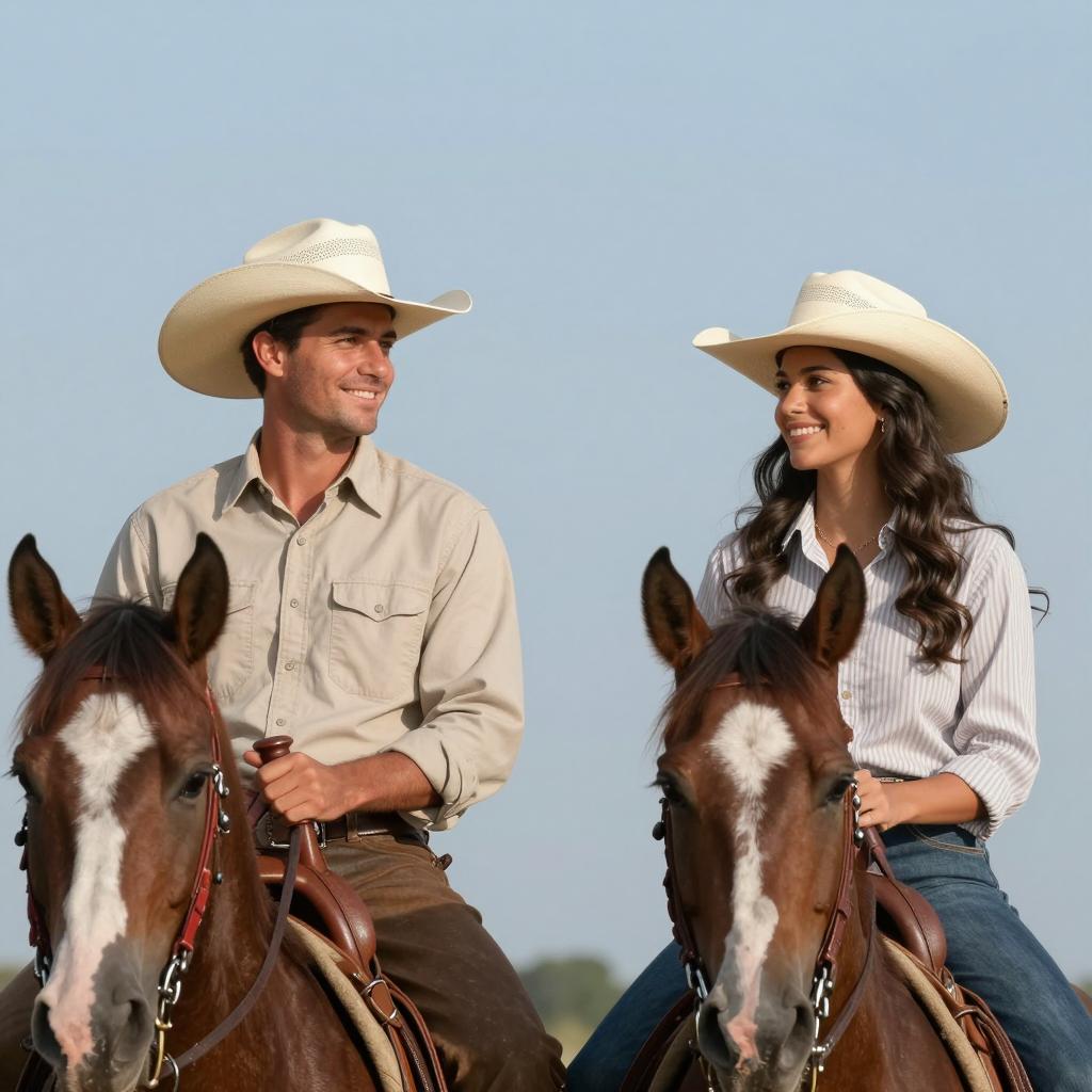 Three men riding horses, from left to right. First man in blue shirt, brown hat, brown pants, serious expression. Middle man in white hat, plaid shirt, light gray pants, smiling. Third man in blue cap, navy jacket, white shirt, gesturing with right hand, determined expression. Clear sky background, desert landscape, horses in foreground.