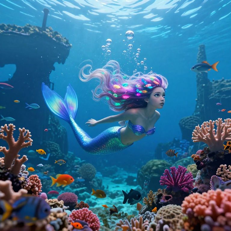 Photograph-like CGI image of a vibrant underwater scene featuring a blue and green mermaid with flowing brown hair, mid-dance, surrounded by colorful coral, sea anemones, and various fish. A large orange fish swims to the left, and a small white and red conical structure sits in a scallop shell-like base in the foreground. A white, dome-topped gazebo is in the background. Sunlight filters from above, illuminating the scene with a magical, ethereal glow. The mermaid's tail is detailed with shimmering scales, and the corals are vividly colored, enhancing the fantasy-like atmosphere.