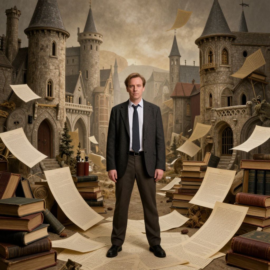Photograph of a serious-looking middle-aged man with short brown hair, wearing a black suit, white shirt, and black tie, standing in the center of a fantastical medieval castle courtyard. The background features tall, grey stone towers with conical roofs and arched windows. Stacks of old, leather-bound books and swirling parchment scrolls surround him, with more scrolls flying through the air. The sky is overcast, adding a dramatic, mysterious ambiance to the scene. The man's expression is stern, and he stands with his hands by his sides. The overall style is dramatic and fantasy-themed.