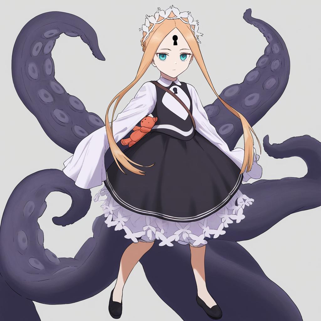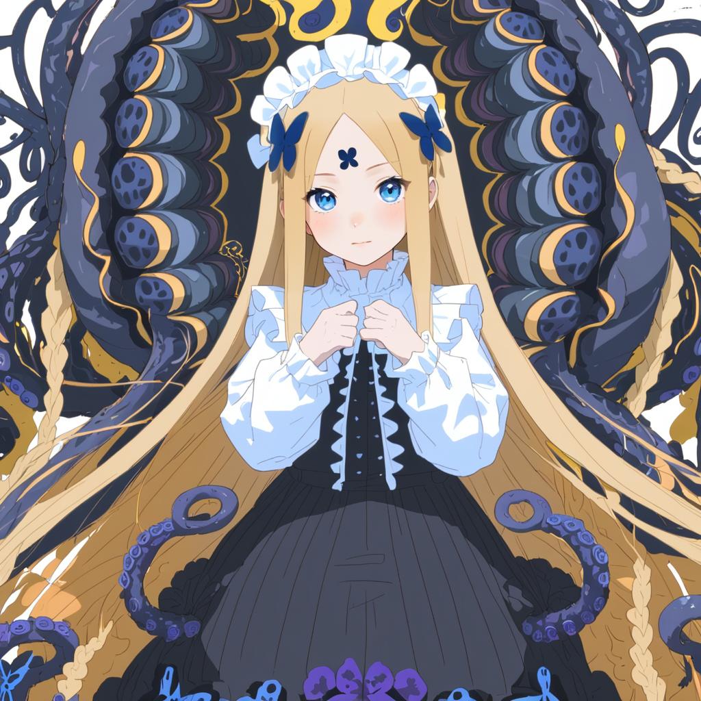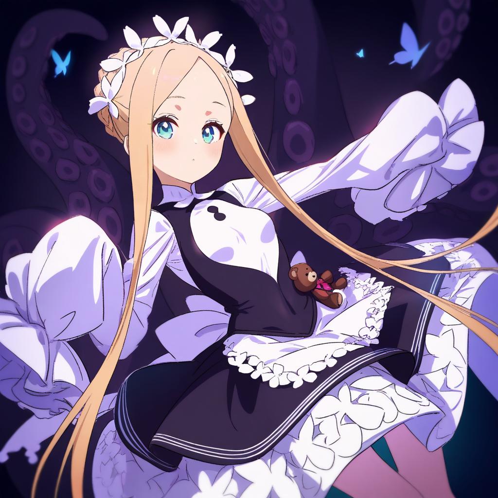 Illustration of Abigail Williams from Fate/Grand Order wearing a black and white festival maid outfit, featuring a maid headdress, very long blonde hair with a butterfly ornament, blue eyes, and a black dress combined with a white shirt and skirt. She has long, flowing sleeves and is surrounded by large purple and black tentacles, adding a mystical element to the image.