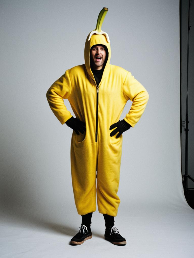 Person in Banana Costume, photorealistic studio portrait, comedic realism