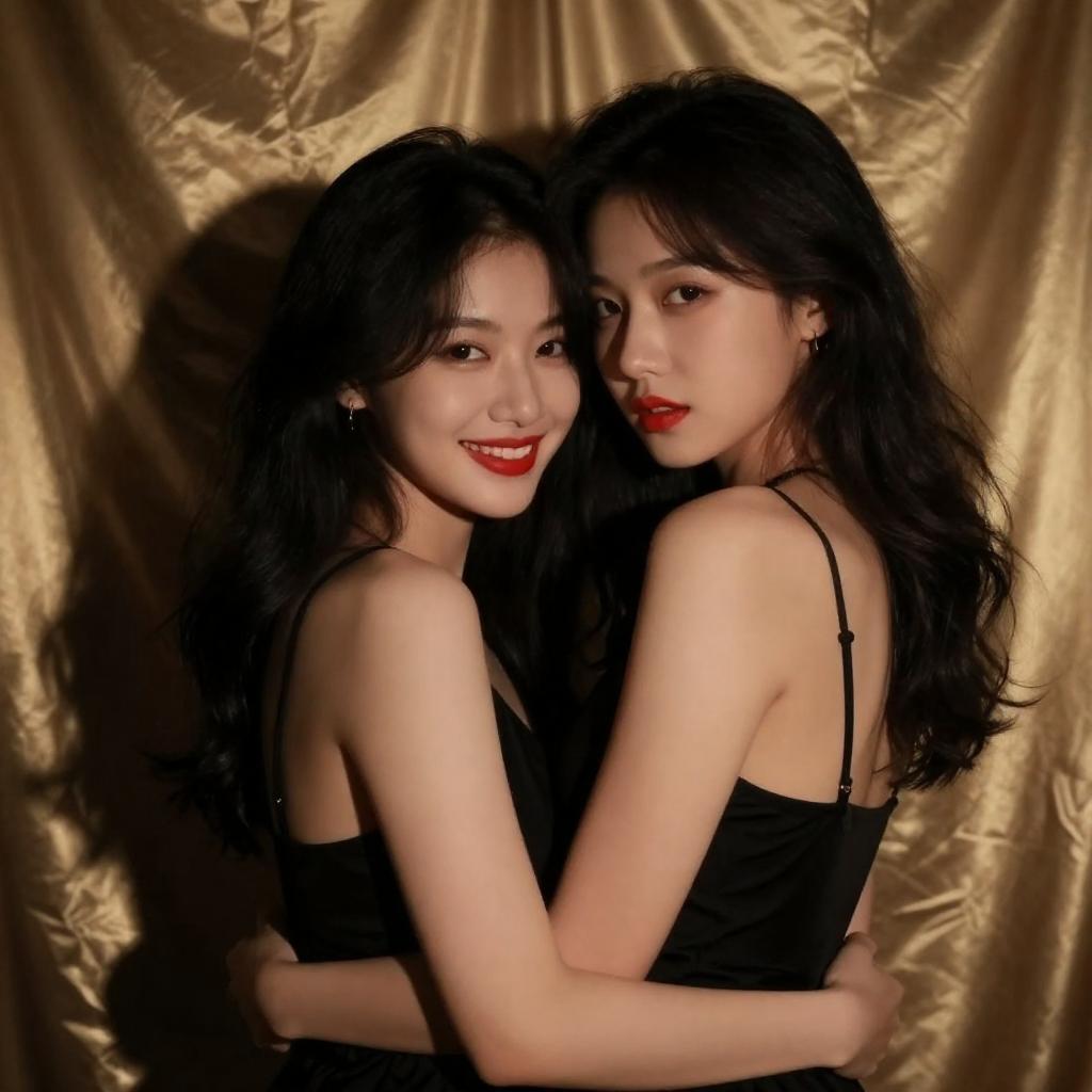 Photograph of two women with dark hair and red lipstick, dressed in black, embracing intimately in a dimly lit, reflective golden background. The woman on the left smiles, while the woman on the right looks over her shoulder, creating a sensual, shadowy atmosphere.
