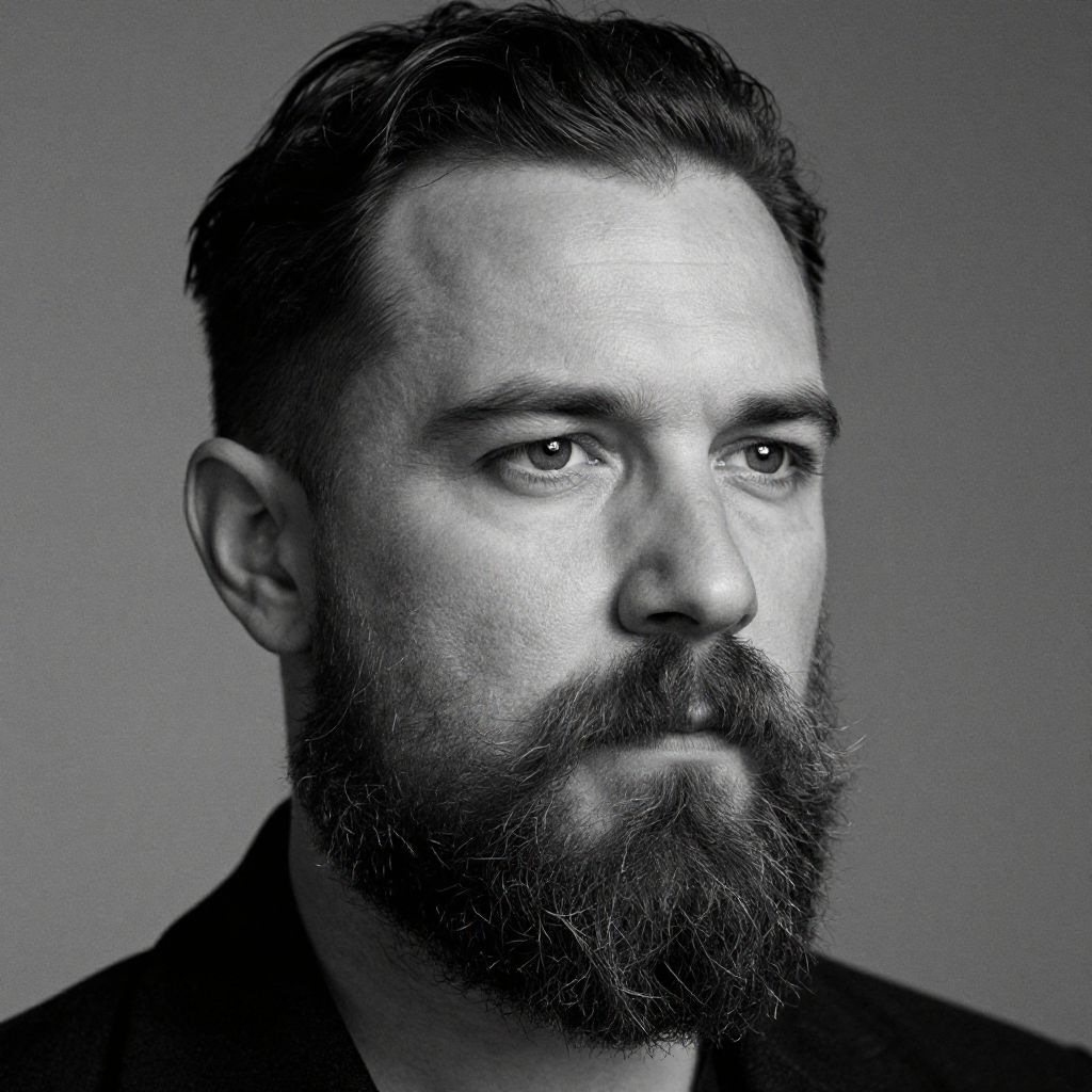 Add beard to photo of black and white vintage style portrait, man with confident gaze, thick and well-shaped beard, high contrast shadows, fine grain texture, classic studio lighting capturing intricate details of hair and facial contours.