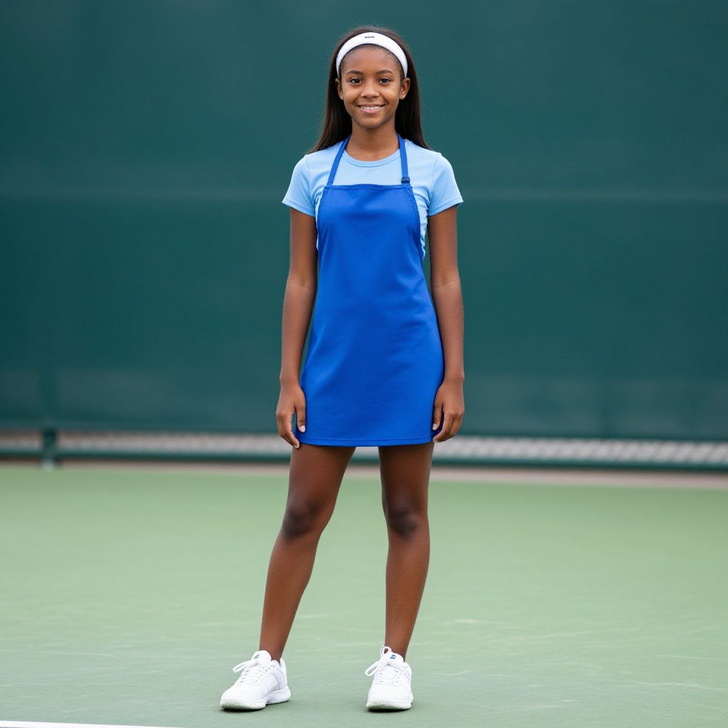 Photograph of a young Black girl standing on a green tennis court. She has dark skin, long straight black hair, and wears a white headband. She is dressed in a light blue short-sleeved shirt and a royal blue tennis dress with white drawstrings. She also wears white tennis shoes and stands with a slight smile. The background is a dark green tennis court wall, slightly out of focus, emphasizing her as the central subject. The image has a bright, even lighting, highlighting her cheerful expression and athletic attire.