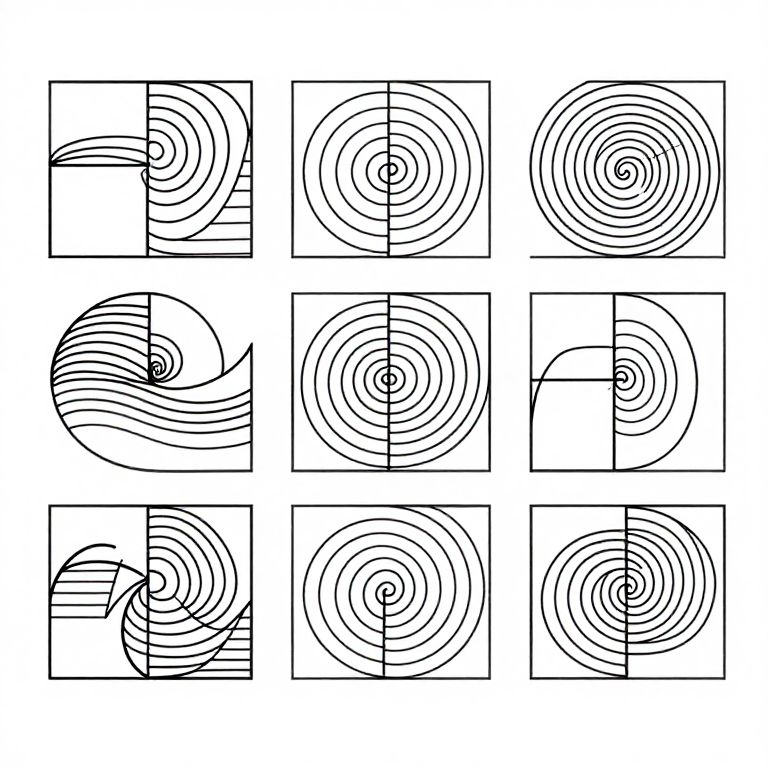 Fibonacci coloring pages showing abstract wave and spiral motifs arranged in a harmonious sequence, precise line drawings incorporating the Fibonacci sequence in artistic geometry, minimalist yet visually captivating for coloring enthusiasts.