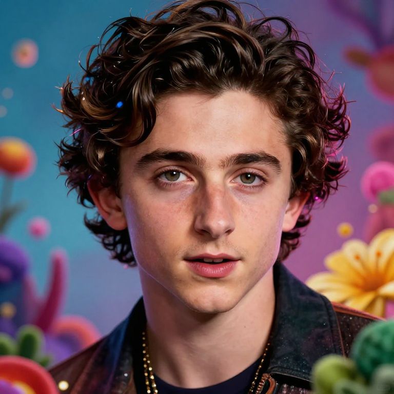 This is a digitally created portrait of a young man with fair skin, curly dark brown hair, and blue eyes. He has a slight smile and wears a black jacket with a gold chain necklace. The background is a vibrant, colorful blend of blue and pink hues, adorned with out-of-focus, whimsical flowers in shades of red, yellow, and purple. The image has a surreal, almost dreamlike quality, with a slight glow around the subject's hair and a soft-focus effect on the background, enhancing the portrait's ethereal feel.